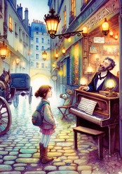 今回の改訂新版では、AI技術のめざましい進歩をふまえていくつかのイラストを新しく描き直し、ブックデザインも大きくリニューアルしました。さらに、各物語の後には「解説」を加え、タイトルの意味や楽曲と関連した物語の勘所をワンポイントで紹介しています。レッスンの場面では、この解説が特に役立つでしょう。たとえば「アラベスク」という言葉を辞書で調べても、すぐに音楽のイメージには結びつきません。本書の物語と解説を手がかりにすれば、子どもたちは「こういう模様から広がる世界なんだ」と具体的に想像でき、演奏に自然な表情をのせることができます。先生やご家族にとっても、標題の意味を説明する際の心強い味方になるはずです。